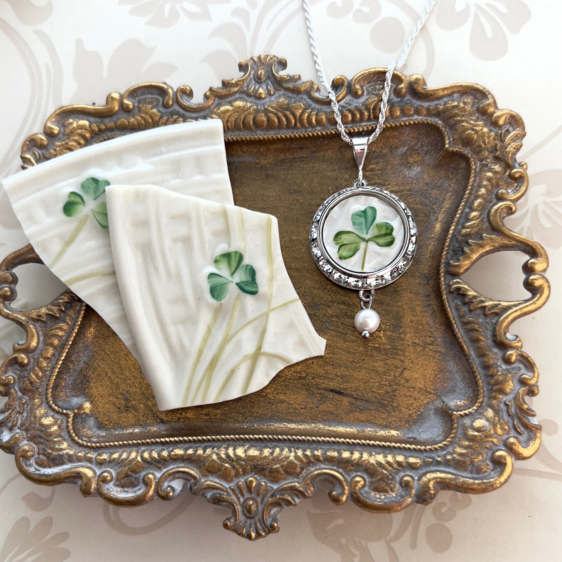 St Patricks Day Shamrock Necklace, Repurposed Irish Belleek, Crystal Broken China Jewelry, 18th Anniversary Gift for Wife, Gifts for Women